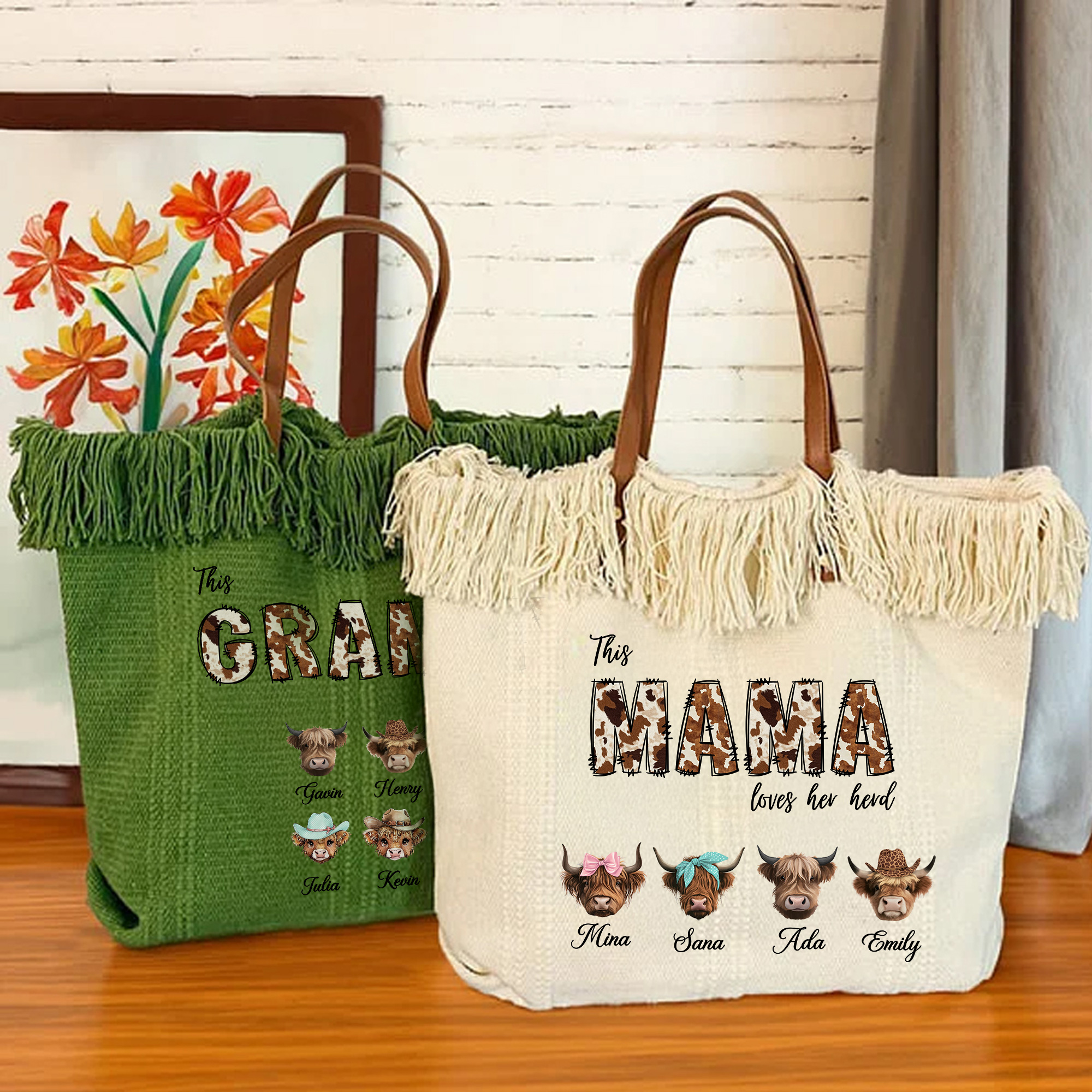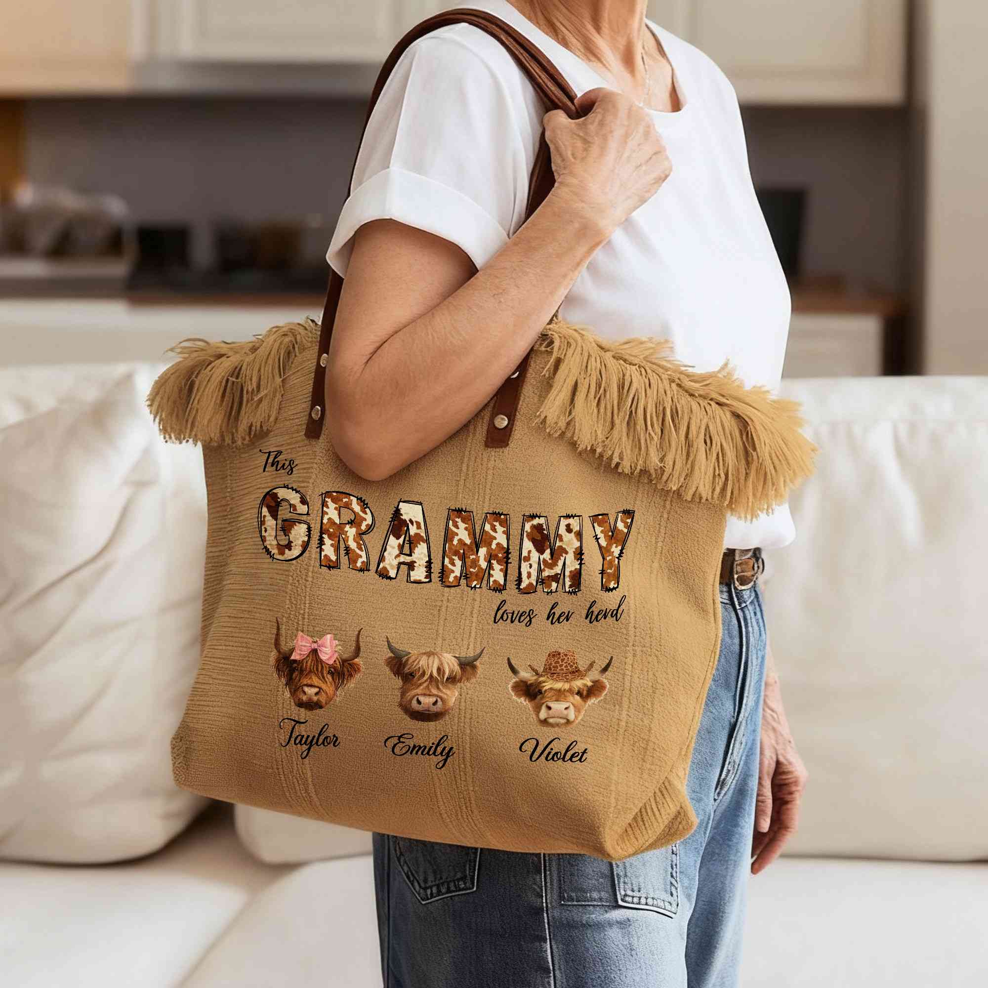 Gift for Grandma/Mom - This personalized highland cow tote bag suits many occasions including birthdays, Mother’s Day, holidays, or family gatherings. A meaningful gift choice for moms, grandmothers, or any woman who treasures her family and enjoys rustic Western style.