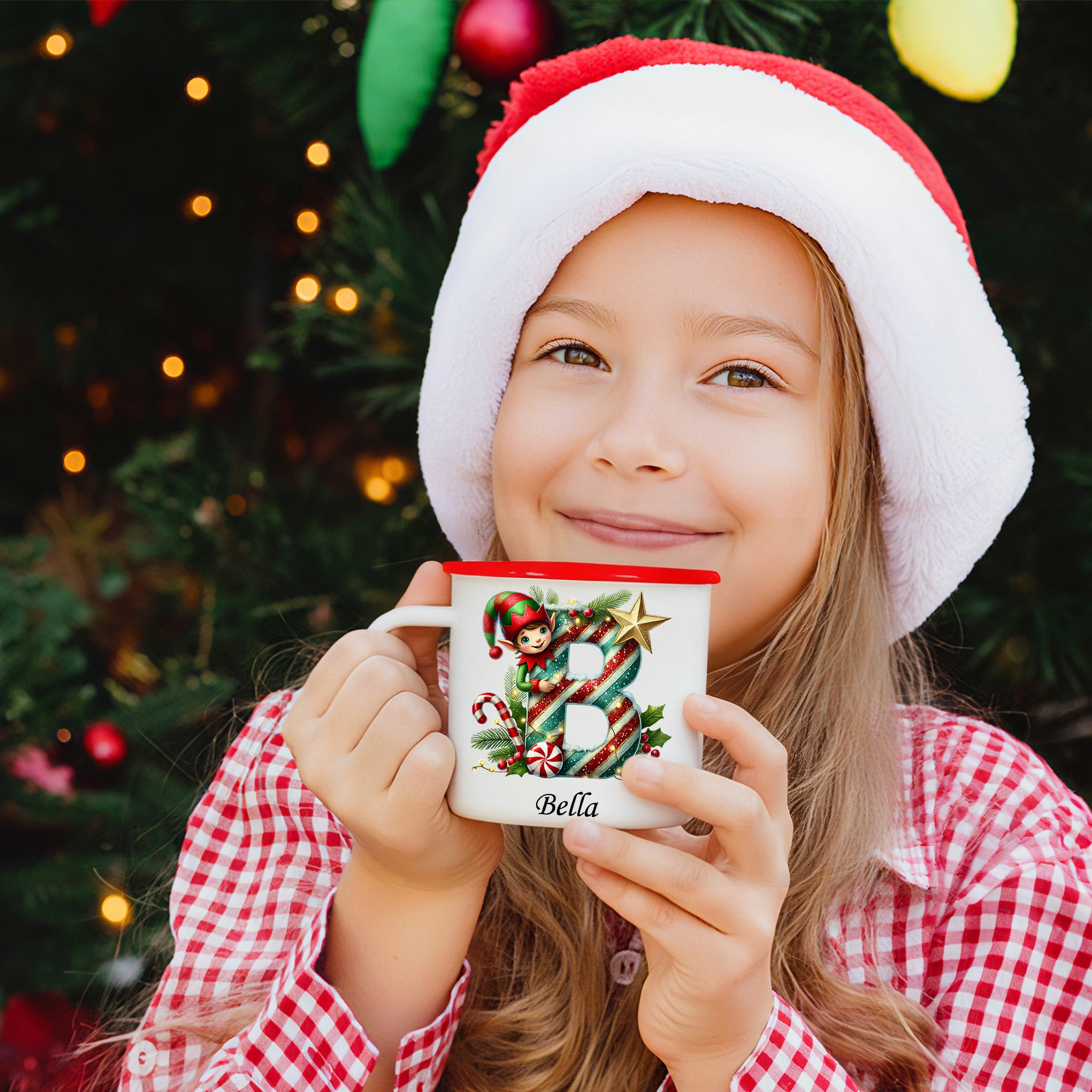 Charming Christmas Design - This enamel mug features a cheerful elf and candy cane alphabet design that brings festive joy to every sip. Each cup showcases bright holiday colors and cute cartoon details that children will adore, adding a touch of Christmas magic to cocoa or milk time.