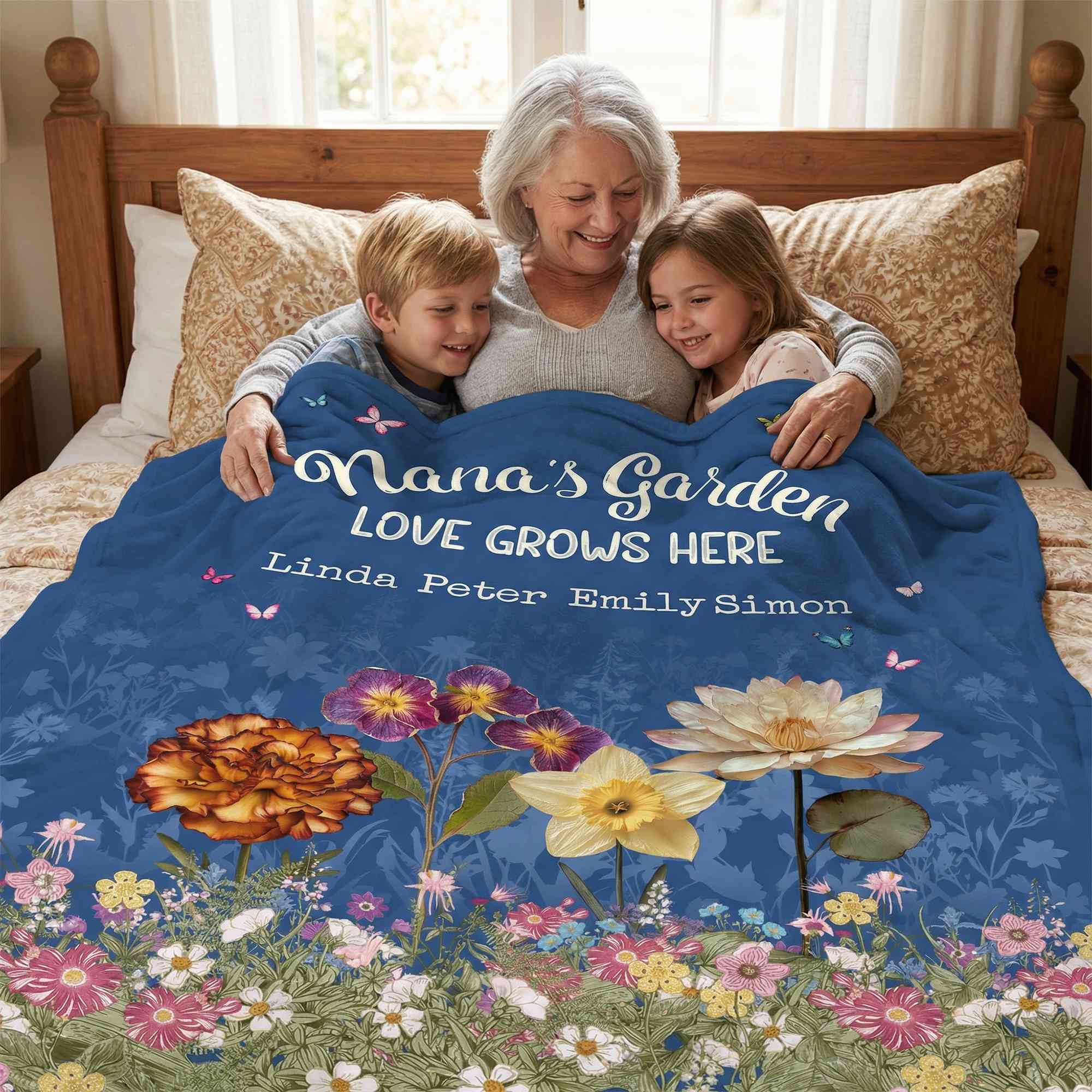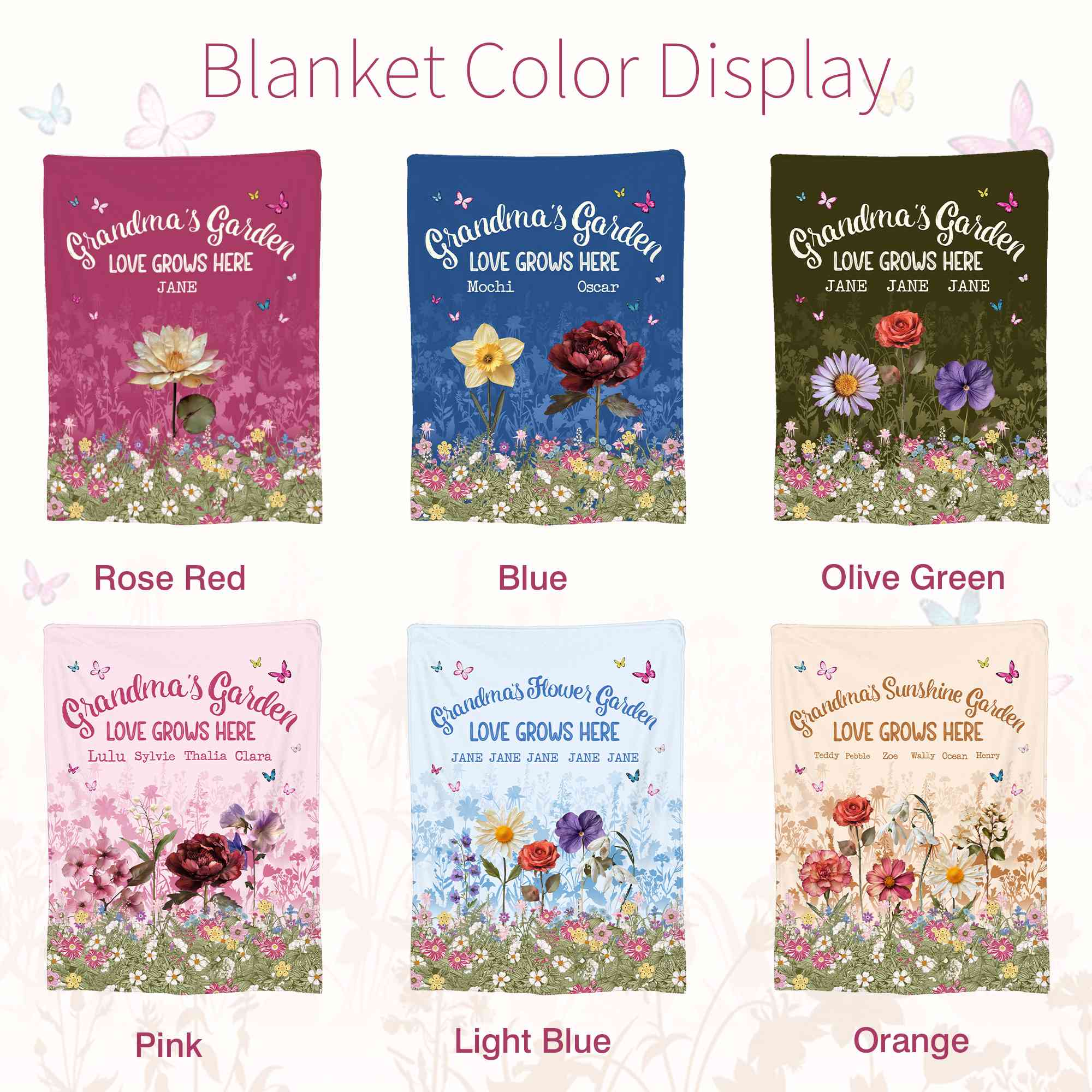 Personalized Names & Birth Flowers Butterflies Grandma's Garden Blanket, Flannel/Sherpa Bed Couch Throw, Birthday/Mother's Day Gift for Mom/Grandma