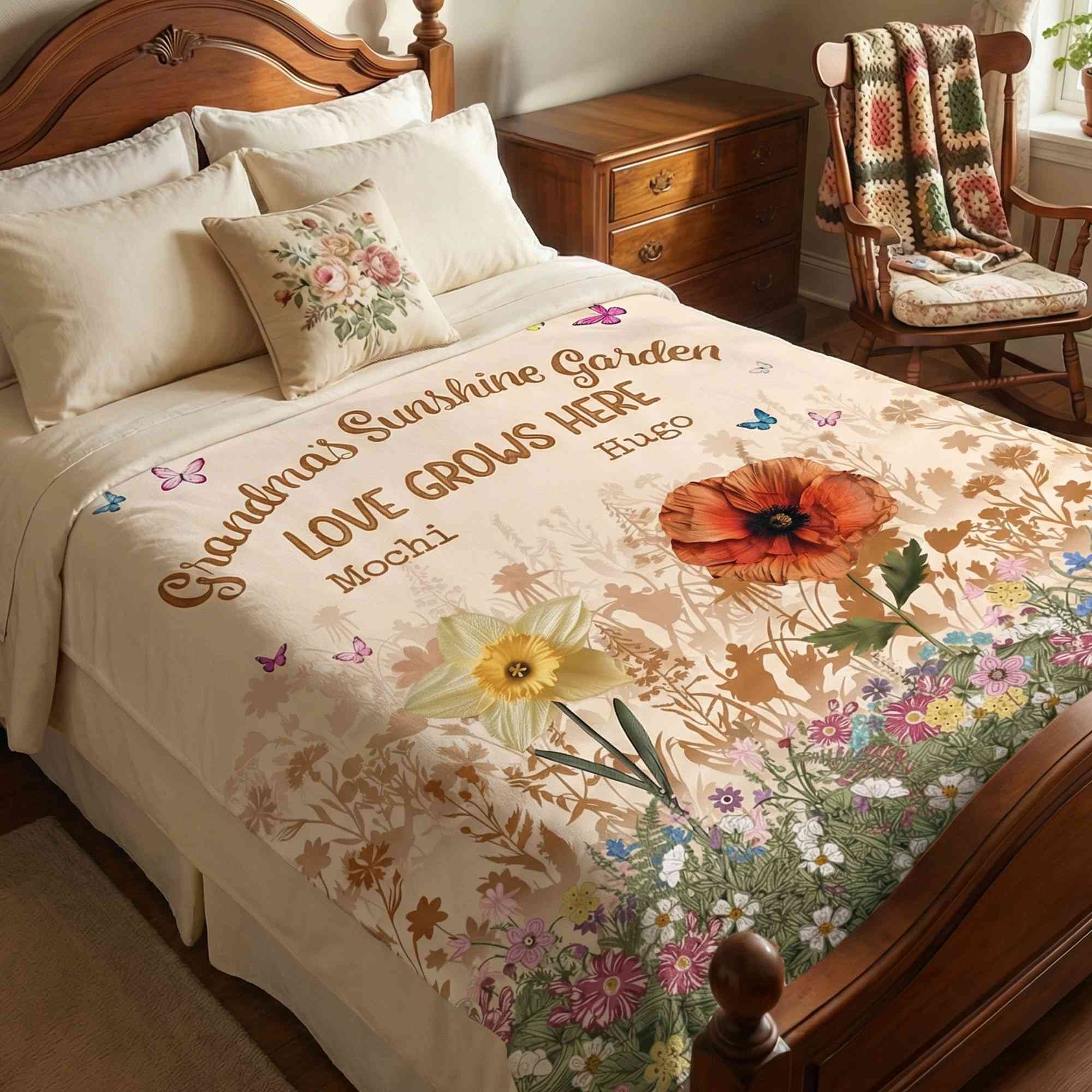 Grandma’s Garden Design - This blanket features a beautiful garden theme filled with butterflies and birth flowers. Each flower represents a loved one, creating a colorful and meaningful display that celebrates family. The soft multicolor artwork brings warmth and a cheerful touch to any bed, sofa, or reading chair.